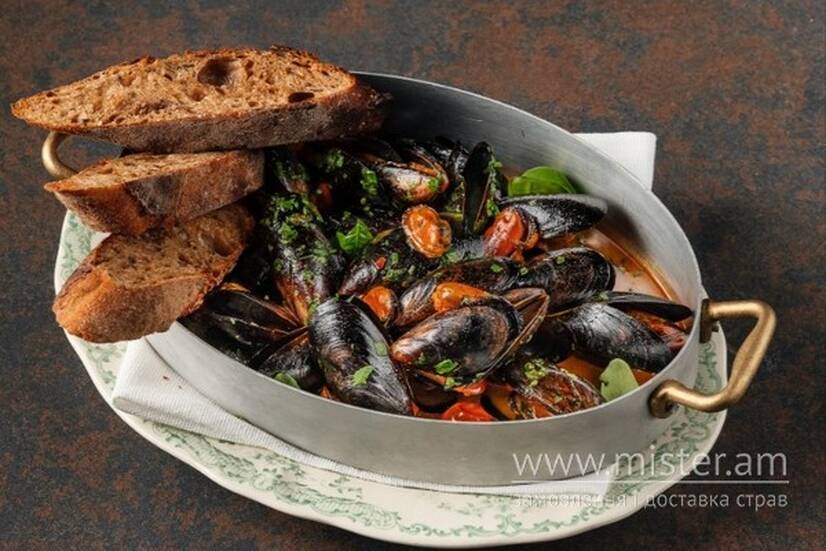 Вершкове масло, ріпчаста цибуля, петрушка, біле вино, лимон, часникова олія, чілі, рибний бульйон, чері, пармезан, грінки з гречаного багету.