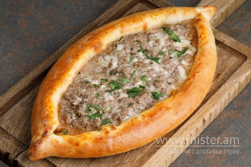 Дріжджове тісто, соус на основі томатів Пелаті, яловичий фарш, 3 сири, петрушка, зіра, коріандр. Змащується вершковим маслом.