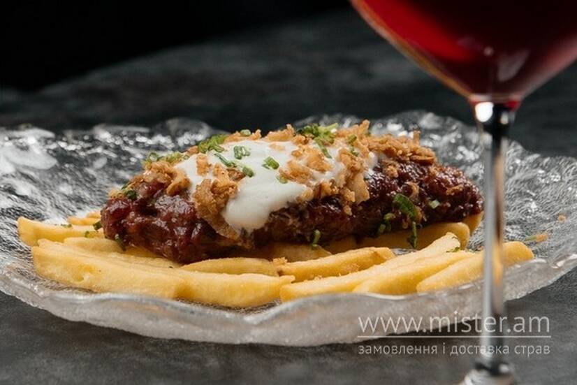 Дрібнонарізана телятина збита з перепеленим жовтком та рослинною олією, кримська цибуля, соус Ворчестр, трюфельна олія, оливкова олія, каперси, гірчиця. Подача на картоплі фрі, зверху грецький йогурт, тогараши, цибулевий кранч, зелена цибуля.
