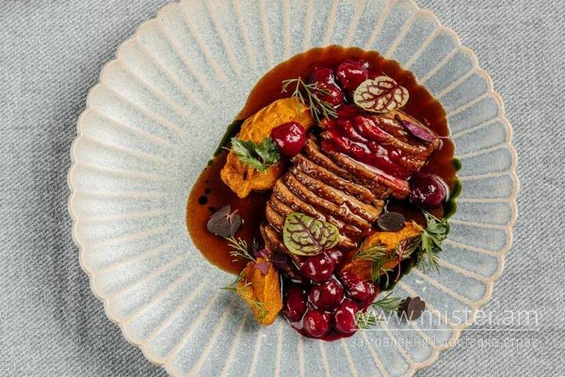 Качина грудка су-від маринована в соєвому соусі, подається з кремом з моркви, демігляс, компоте вишні, зелена олія.