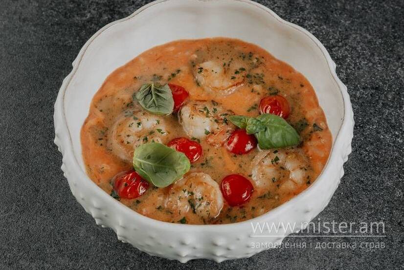Соус (біле вино, вершкове масло, тим`ян, пармезан, курячий бульйон, печений перець), рис арборіо, подаємо з креветками у вершково-лимонному соусі з петрушкою та базиліком.