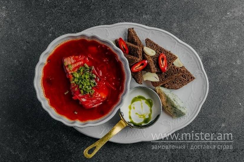 Буряк, морква, картопля, кріп, свинне ребро. Подається з бородинським хлібом, перцем чилі, салом, сметаною та часником.