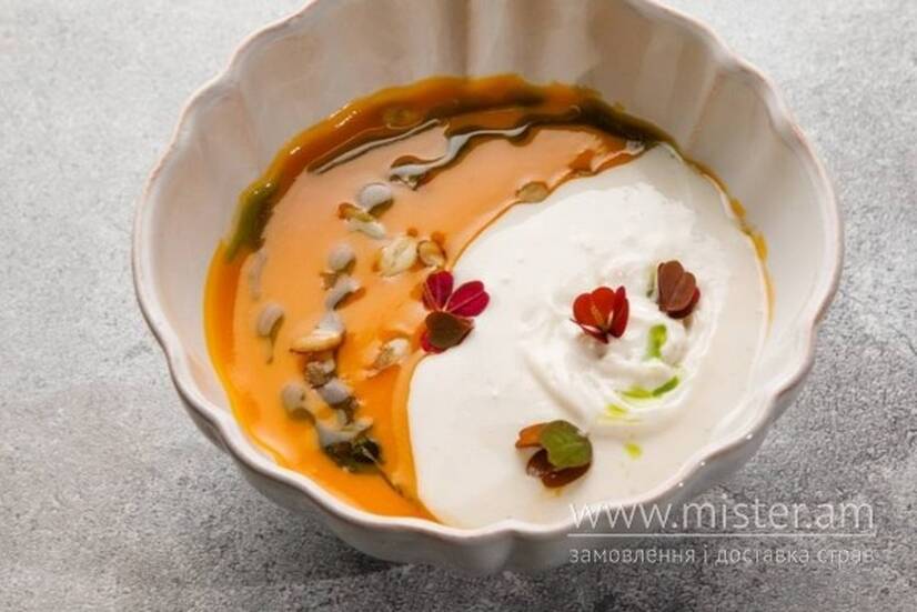 Гарбуз, картопля цибуля, морква, бульйон курячий, вершки, кориця, тимян, часник запікаються, креветки та сирна еспума (на основі вершків, горгонзоли, моцарели, пармезану) насіння льону та гарбуза, поливається гарбузовим маслом.