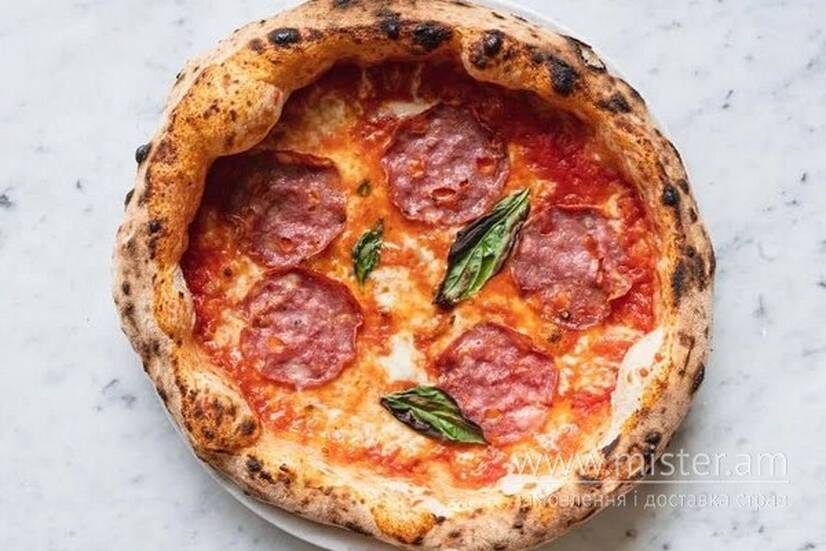Неаполітанське ферментоване тісто, томатна основа, сир моцарела, філе стегна курки, мисливські ковбаски, сухі трави.
