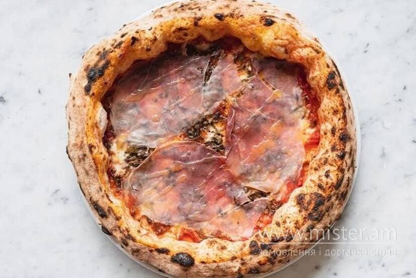 Неаполітанське ферментоване тісто, томатна основа, сир моцарела, прошутто Котто, сир пекоріно.