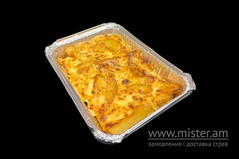 Хрустка картопля, обсмажена до золотистої скоринки, заправлена часником, запечена з сирним соусом.