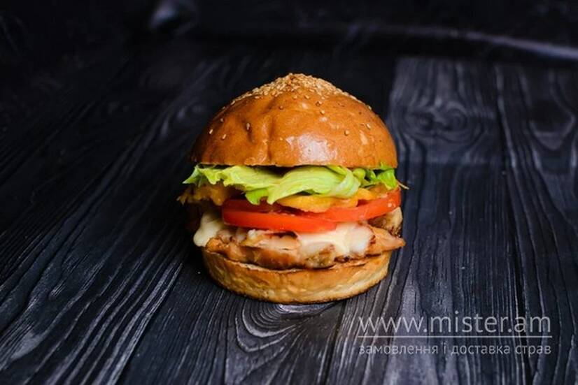 Булочка з кунжутом, соус червоний, соус часниковий, листя салату, м'ясо куряче, цибуля червона, помідор, огірок маринований, сир твердий, сир моцарела.