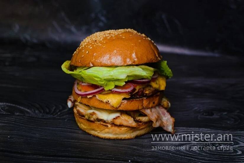 Булочка з кунжутом, соус червоний, гірчиця американська, листя салату, м`ясо куряче, фарш м`ясний, бекон, сир моцарела, сир твердий, цибуля червона, помідори, огірок маринований.