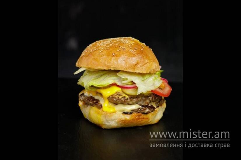 Булочка з кунжутом, листя салату, дві котлети м`ясні ,подвійний сир, помідор, огірок маринований, цибуля червона, соус червоний.
