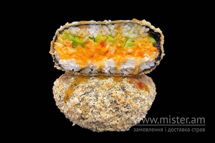 Рис, норі, крем-сир, креветки тигрові, ікра масаго, соус спайсі , авокадо, кляр темпура, пластівці панко.