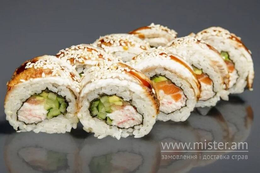 Вугор, лосось, краб сніжний, огірок, авокадо, кунжут, соус Унагі, рис, норі.