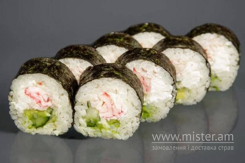 Краб сніжний, крем-сир, авокадо, огірок, рис, норі, імбир рожевий, васабі, соєвий соус.