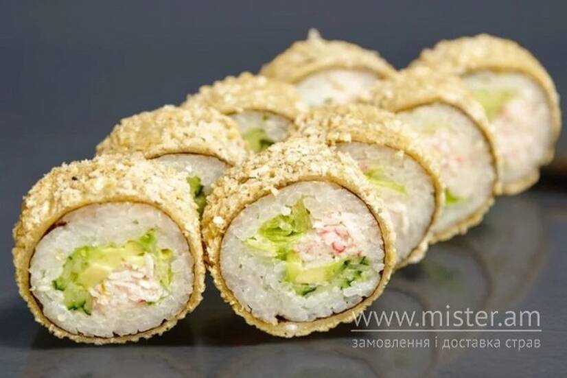 Краб сніжний, крем-сир, авокадо, огірок, рис, норі, кляр, сухарі панко.