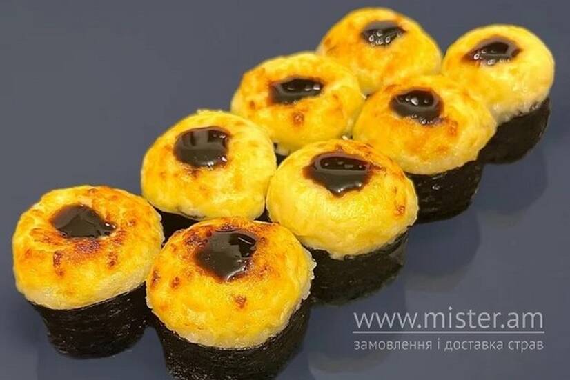 Лосось, вугор, крем-сир, салат айсберг, сирний мікс, соус Унагі, рис, норі.