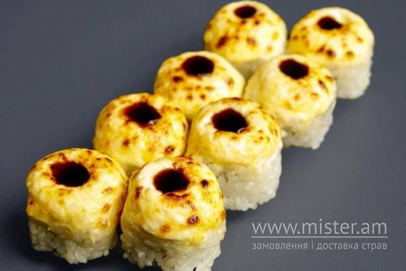 Куряче філе, крем-сир, салат айсберг, сирний мікс, соус Унагі, рис, норі.