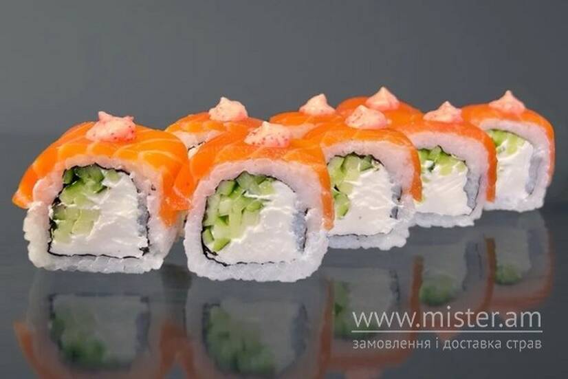 Лосось копчений, крем-сир, огірок, рис, норі.