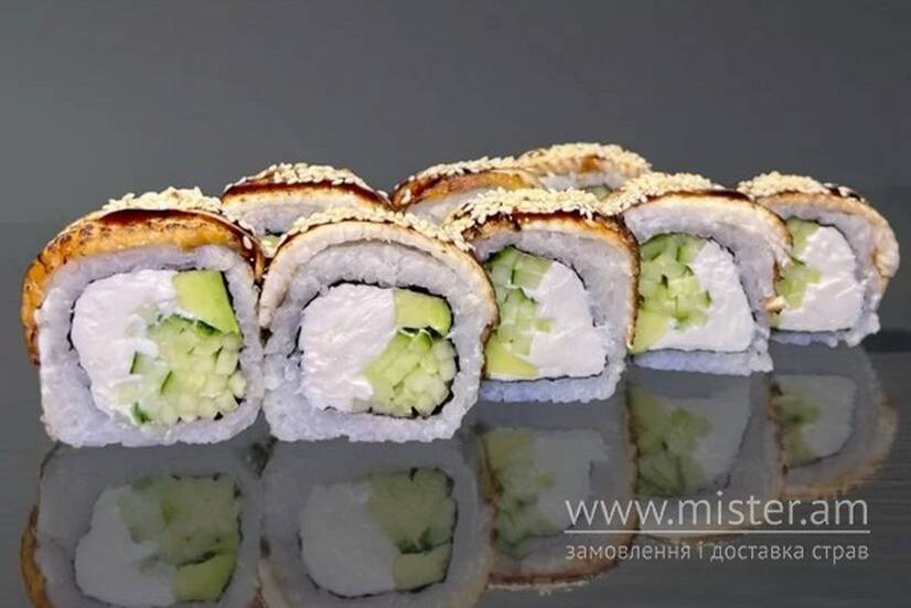 Вугор, крем-сир, огірок, авокадо, рис, норі, соус унагі, кунжут білий.