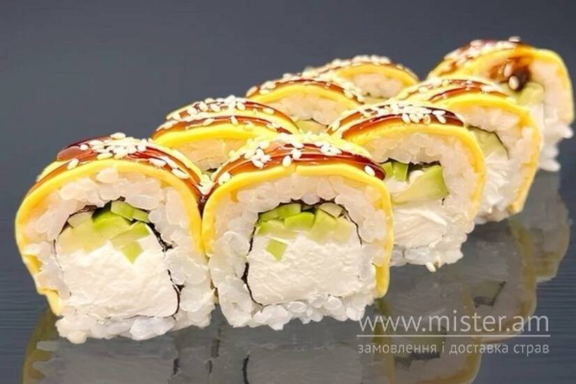 Авокадо, сир тостерний, крем-сир, норі, рис, соус унагі, кунжут.