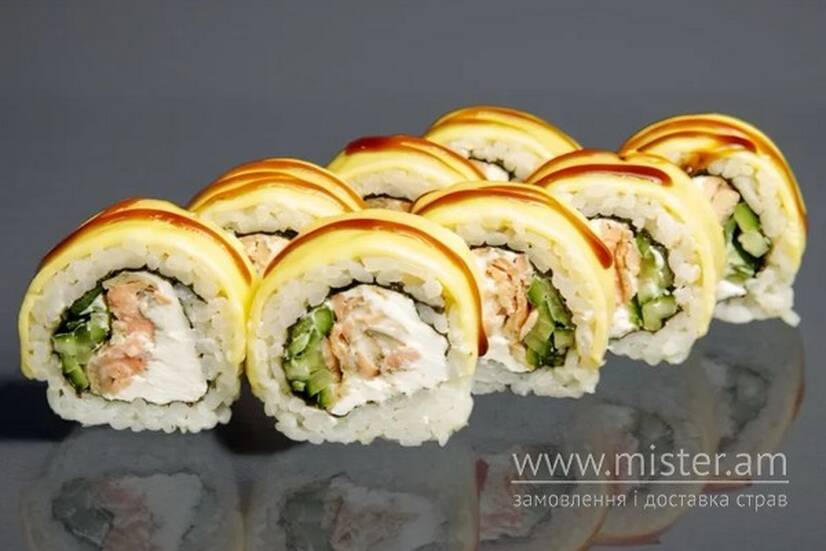 Лосось смажений, крем-сир, тостерний сир, огірок, соус унагі, рис, норі.