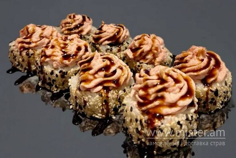 Соус лава, крем-сир, огірок, айсберг, кунжут білий, норі, рис.