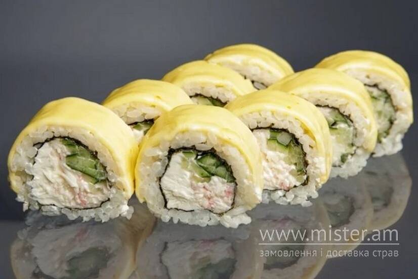 Краб сніжний, сир тостерний, огірок, норі, рис.