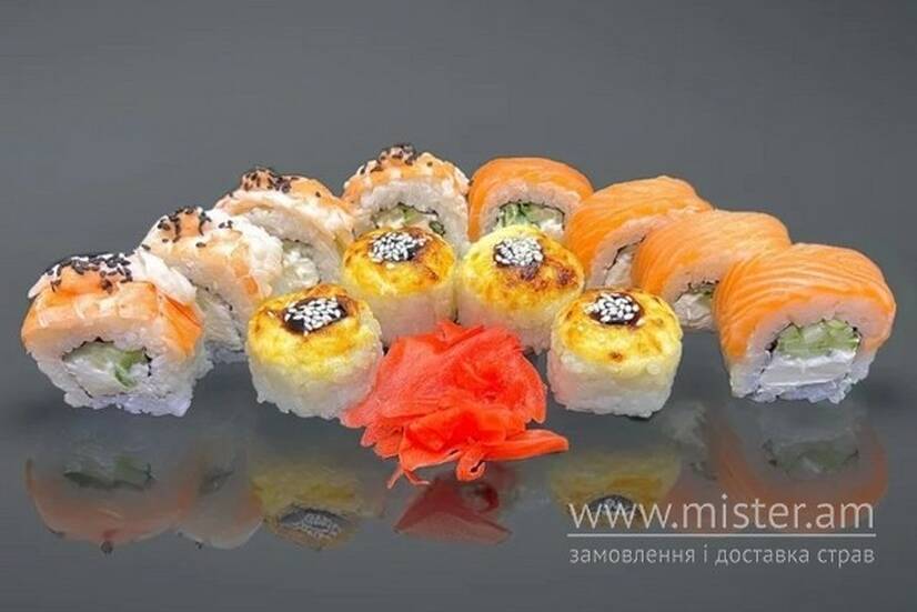 Філадельфія з лососем /50, Філадельфія з креветкою /50, Ніжний з куркою /50. 12 шм.
