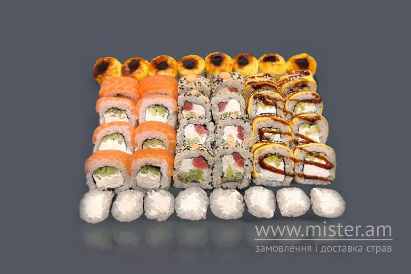 Ніжний з куркою, Філадельфія з лососем, Філадельфія з тунцем в кунжуті, Чіз рол, Макі з крем-сир. 40 шм.