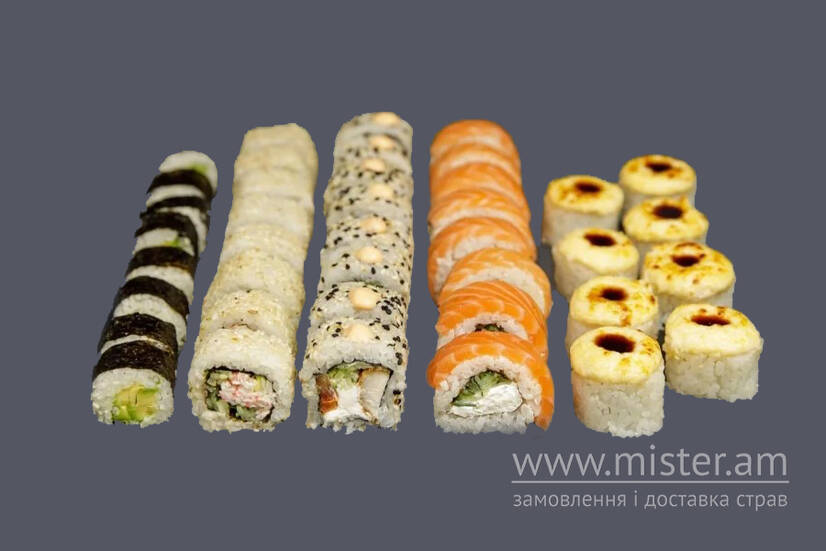 Каліфорнія крабмікс, Філадельфія з лососем, Чікен спайсі, макі з авокадо, Ніжний з куркою. 40 шм.