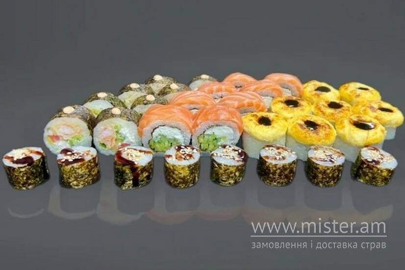 Футомак з креветкою, Філадельфія з лососем, Ніжний з лососем, макі з вугрем. 32 шм.