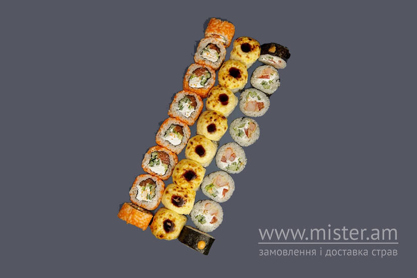 Філадельфія з лососем в ікрі, Ніжний з куркою, Футомак з креветкою. 24 шм.