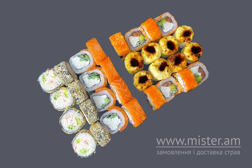 Ніжний з лососем, Філадельфія з лососем, Філадельфія з лососем в ікрі, Темпура краб. 32 шм.