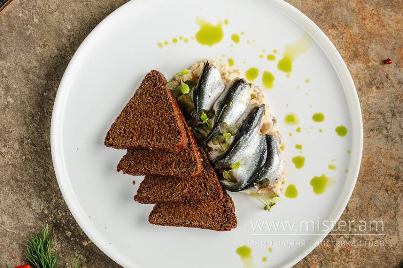 Класична холодна закуска з подрібненого оселедця, картоплі та варених яєць у ніжному майонезному соусі. Завершенням подачі є філе кільки та скибки чорного Бородинського хліба. Подається охолодженим.