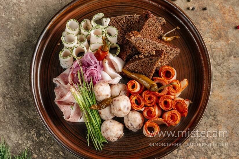 Сало з часником, сало з бастурмою, шпондер копчений, чорні грінки.