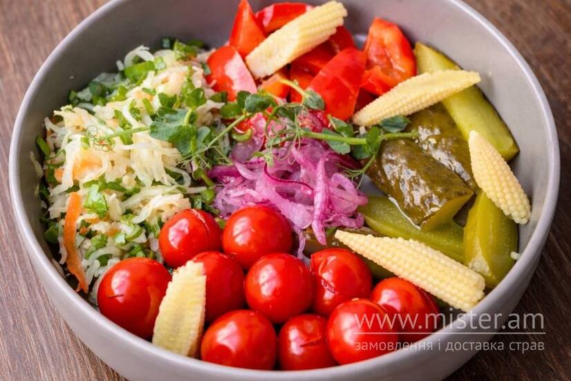 Мариновані томати чері, огірки бочкові, міні-кукурудза, гогошари, квашена капуста.