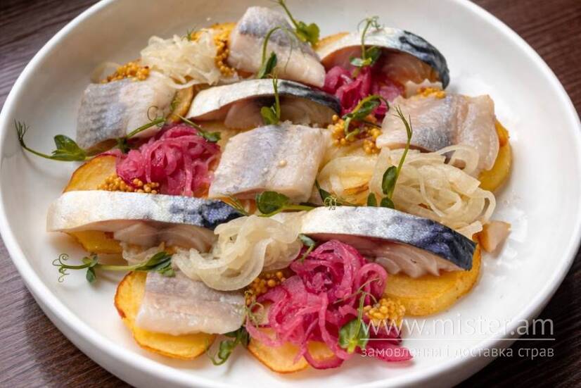 Слабосолене філе оселедця та скумбрії в подачі з відвареною картоплею, маринованою цибулею та пікантною Діжонською гірчицею. Вишукана інтерпретація традиційної закуски з яскравим, збалансованим смаком.