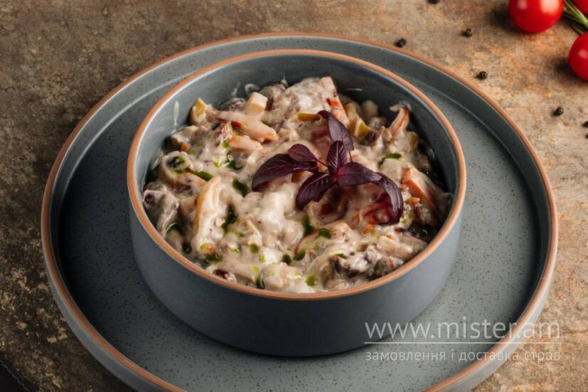 Ніжна тушкована телятина з ароматними яблуками, коренем селери, морквою та в`яленою журавлиною, делікатно доповнена вершковим соусом