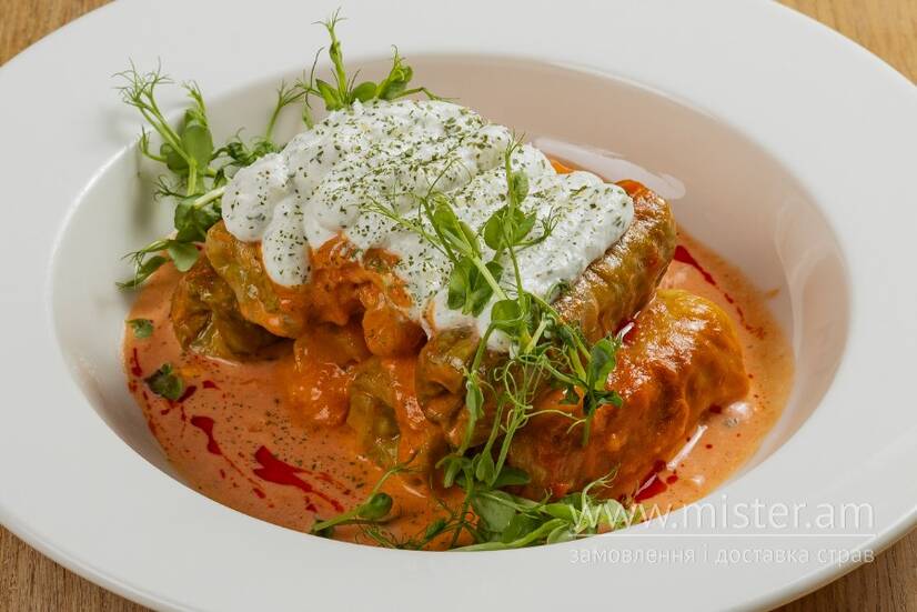 Класичні голубці в томатновершковому соусі з сметанковим мусом та пудрою зелені.