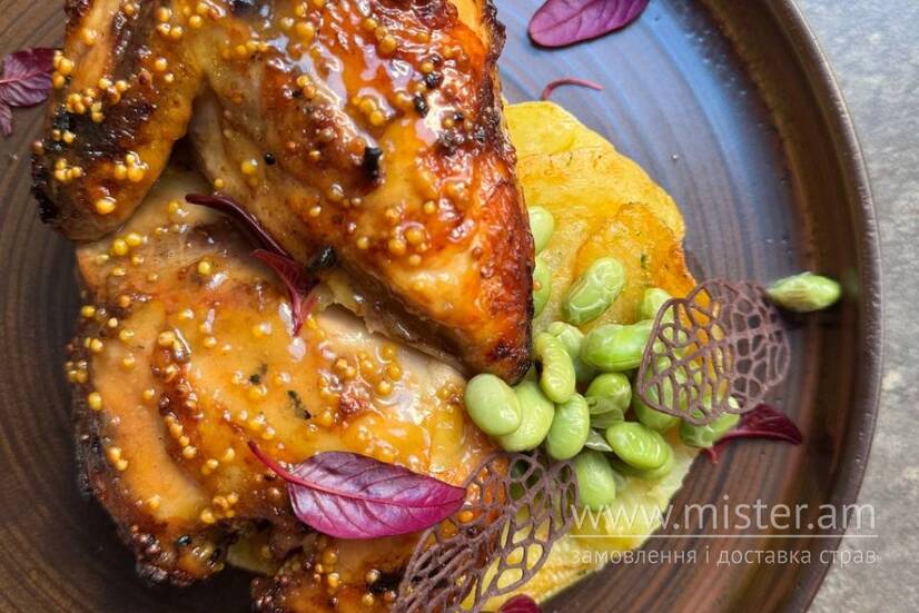 Пів курча, запечене до ідеальної золотистої скоринки в ароматній глазурі, подається з ніжним гарніром із картоплі та бобами едамаме.
