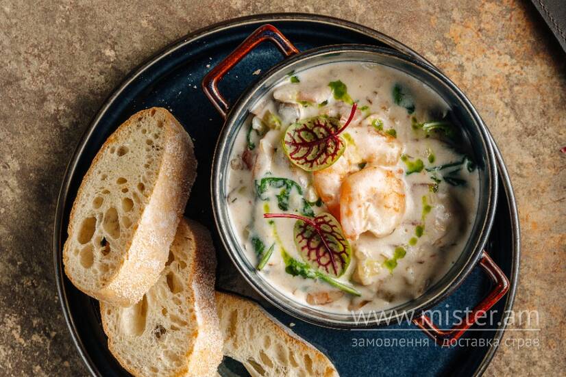 Тигрові креветки у вершковому соусі з білими грибами, копченим шпондером, цибулею та свіжим шпинатом. Подається з хрумкою чіабатою.