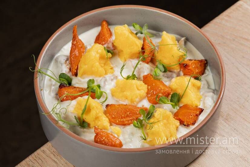 Філе кролика у сметанному соусі. Подається з чипсами з моркви та мамалигою.