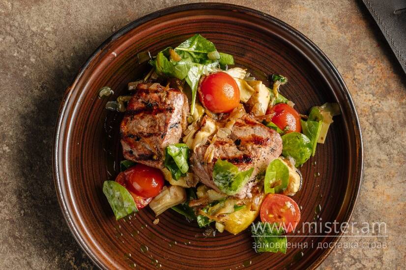 Телячі медальйони подаються з кремовою битою картоплею, ніжними артишоками, соковитими томатами чері, свіжим томленим шпинатом та карамелізованою цибулею.