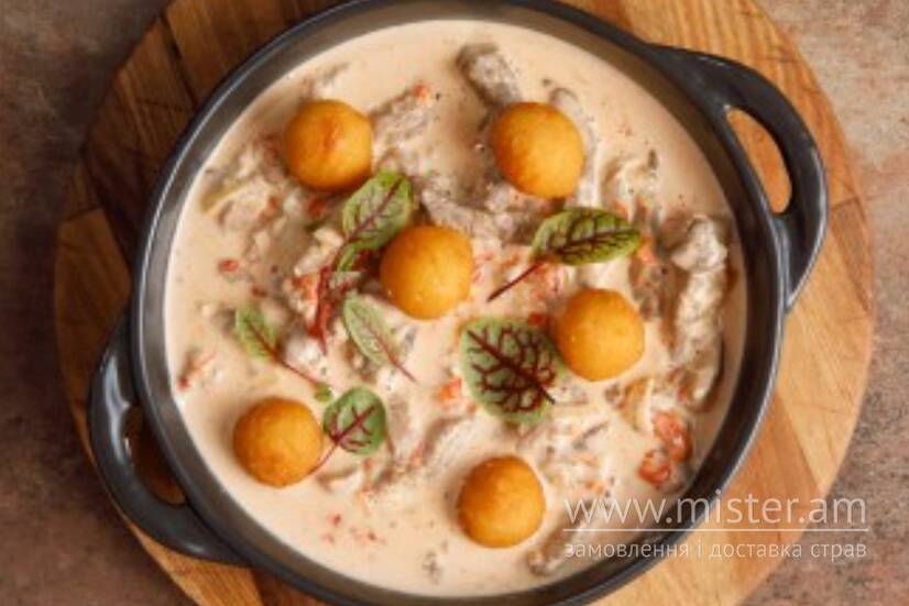 Соковита вирізка зі свинини та яловичини тушкована з болгарським перцем і білою цибулею у ніжному вершковому соусі. Подається з хрусткими картопляними міні-крокетами.