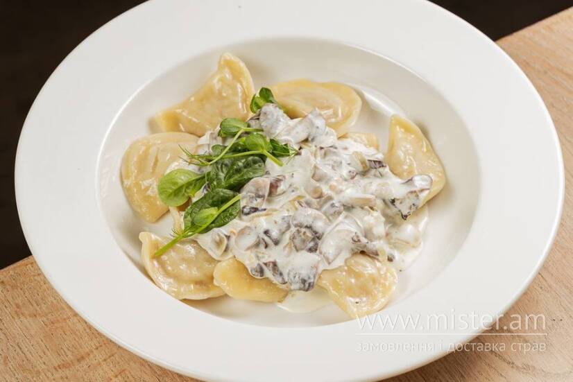 Вареники з картоплею. Подається з вершковим соусом з грибами.