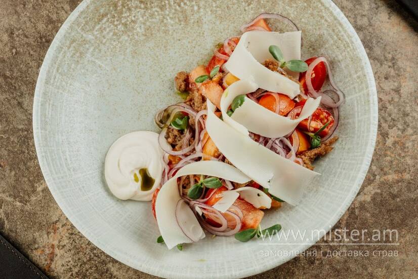 Асорті томатів, мочений хліб, мус на основі копченого сиру, бринзи та м`якого сиру, червона цибуля.