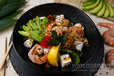 мікс салату, креветка, тобіко, чері, сир фета, авокадо, кораловий гриб, соус азія
