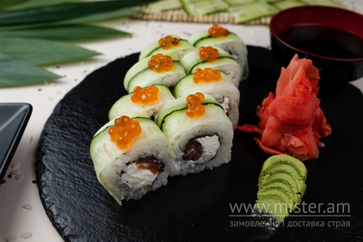 Рис, лосось, філадельфія, огірок, червона ікра.