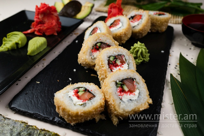 Рис, лосось, філадельфія, тобіко, темтура, спайсі соус.