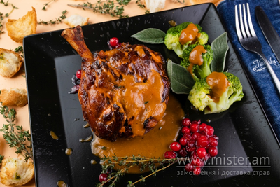 Запечена свинна гомілка з броколі та овочевим соусом.