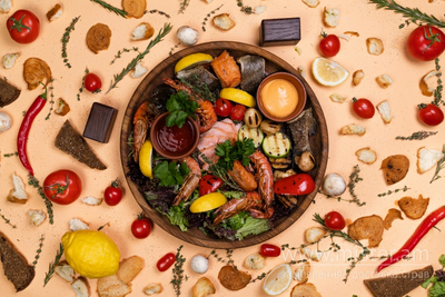Філе лосося, форель, лангустіни, овочі гриль, соус.