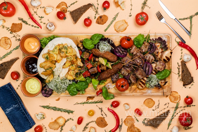 Теляча вирізка, свинна шия, філе куряче, люля-кебаб, овочі гриль, картопля, цибуля маринована, лаваш, соус.